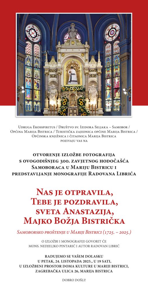 Bistrička“, s fotografijama s ovogodišnjeg 300. zavjetnog hodočašća Samoboraca u Mariju Bistricu, te predstavljanje istoimene knjige autora Radovana Librića, objavljene prigodom 300. hodočašća Samoboraca u Mariju, održat će se u petak 24. listopada u 19 sati u Izložbenom prostoru Doma kulture u Mariji Bistrici. Izložbu zajednički organiziraju Općina Marija Bistrica, Turistička zajednica općine Marija Bistrica, Općinska knjižnica i čitaonica Marija Bistrica zajedno s Udrugom Ekosspiritus i Društvom sv. Izidora Seljaka iz Samobora.